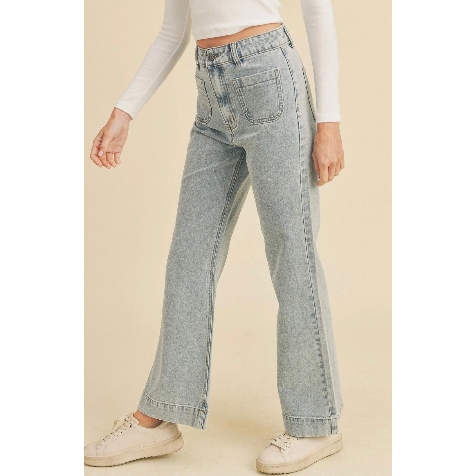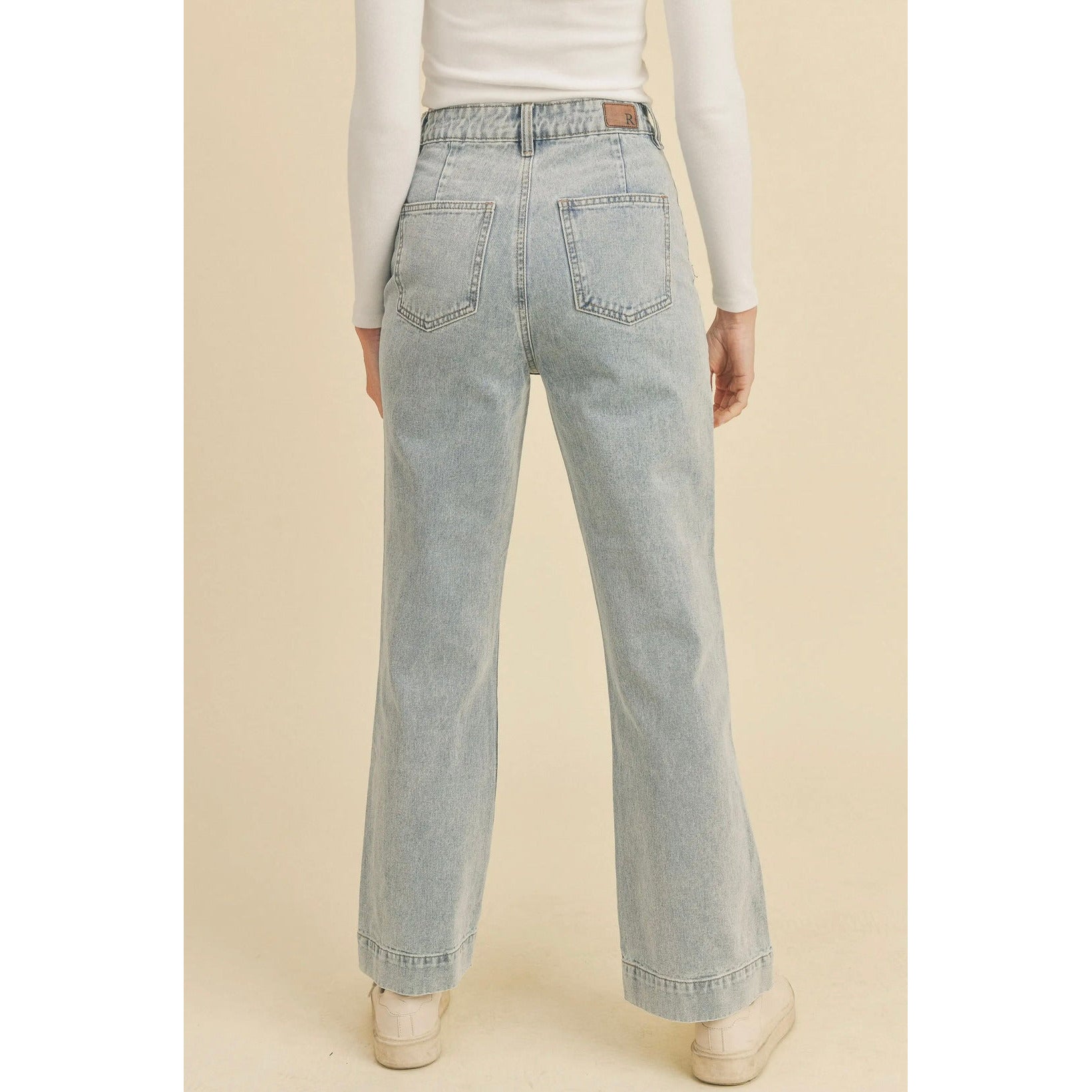 • high-rise and hip-hugging wide-leg fit flares gently at the knee